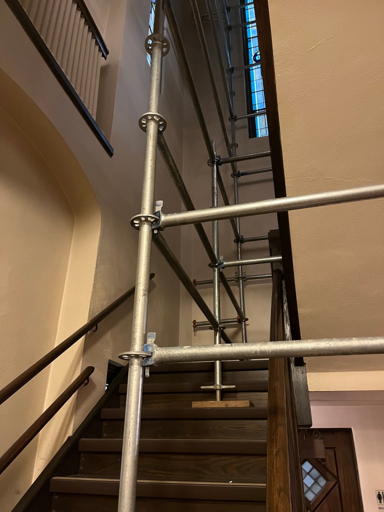 Scaffolding and tarps have been erected with care with hopes that the work goes well and swiftly in there.