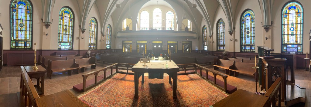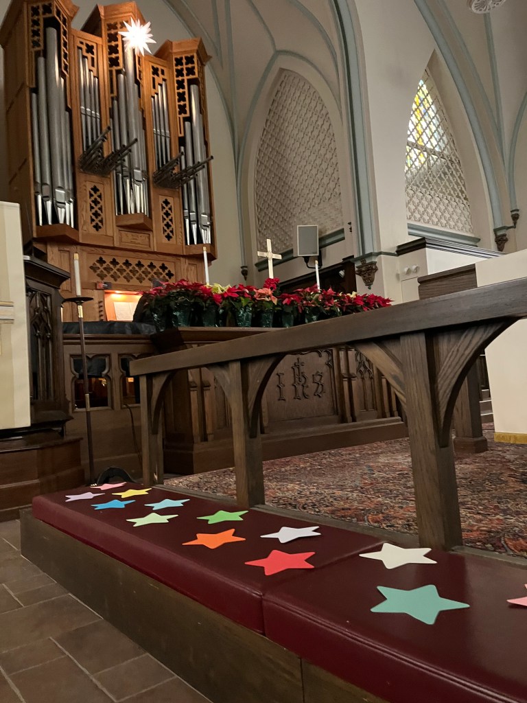 Upon arrival, you’ll receive a bulletin (a program including the order of the worship service) to assist you in participating. We sit in pews (long wooden benches). We sing hymns out of our bulletins or hymnals (books that are located in racks on the back of pews that include all sorts of worship goodness like psalms and hymns and prayers). We stand—as able—and sit during different parts of the service. We pray, listen to the sermon and readings from the Bible, and take some time for silence. We celebrate Holy Communion every Sunday, gathering around the table where Jesus is host.